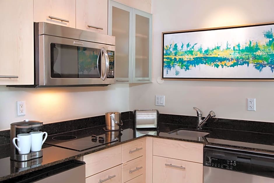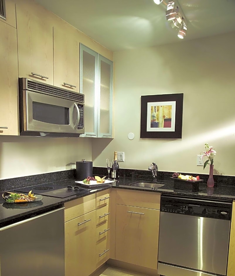 City views, sofa bed, dining table for 4, and kitchen area are just some of the amenities you can enjoy in these suites located in these suites with one queen-sized bed. Relax with modern decor including a marble entry foyer, separate living area with wall-mounted plasma TV and efficiency kitchens complete with marble countertops, refrigerator, 2 burner stove top, microwave, dishwasher and sink. The inviting bathrooms feature a separate marble bath and walk-in shower with rain showerhead.