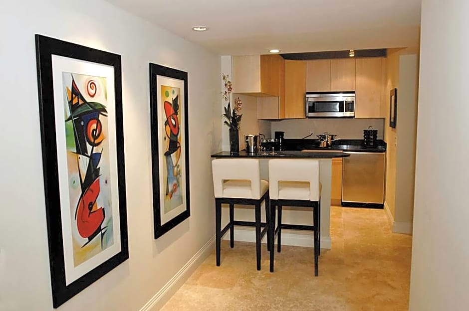 Relax in this suite with its panoramic views of the Intercostal and the Atlantic Ocean with modern decor including a marble entry foyer, separate living area with wall-mounted plasma TV, sofa bed, dining table for 4 and water views. Other amenities you can enjoy in these king-sized bed suites include efficiency kitchens complete with marble countertops, refrigerator, 2 burner stove, microwave, dishwasher and sink. The inviting bathrooms feature a separate marble bath and walk-in shower with rain showerhead.